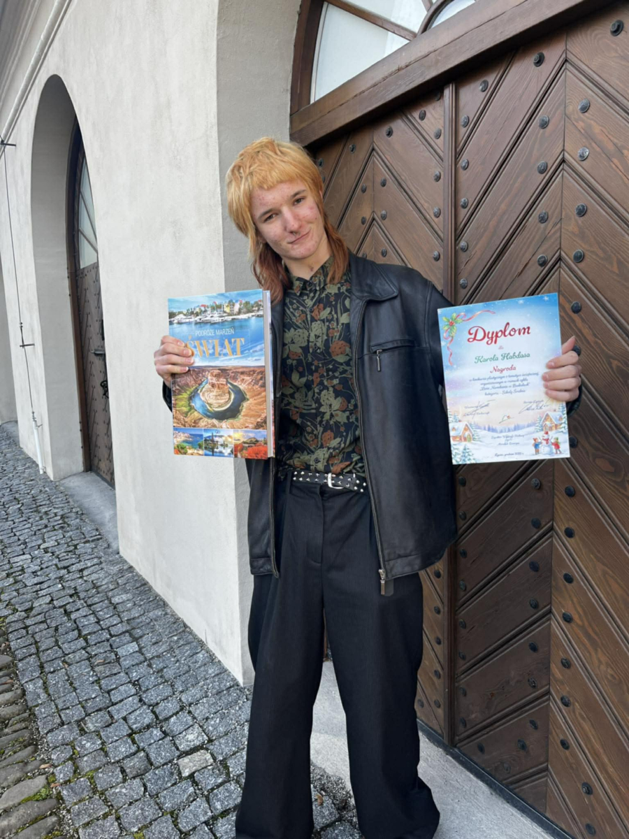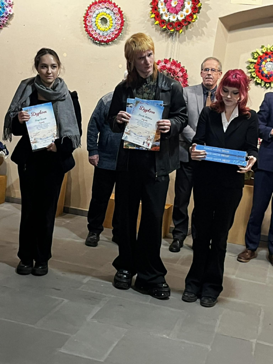 Gratulujemy uczniowi klasy trzeciej Technikum Samochodowego, Karolowi Habdasowi zostania laureatem świątecznego konkursu plastycznego "Boże Narodzenie w Beskidach" organizowanym przez Wydział Turystyki, Kultury, Sportu i Promocji Powiatu Starostwa Powiatowego w Żywcu.